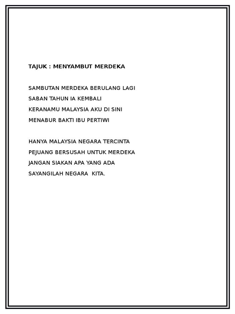 Sajak kemerdekaan 2021 sekolah rendah. Diunggah oleh Jai Arie. Sajak Merdeka Kanak-Kanak - untuk Humaira.